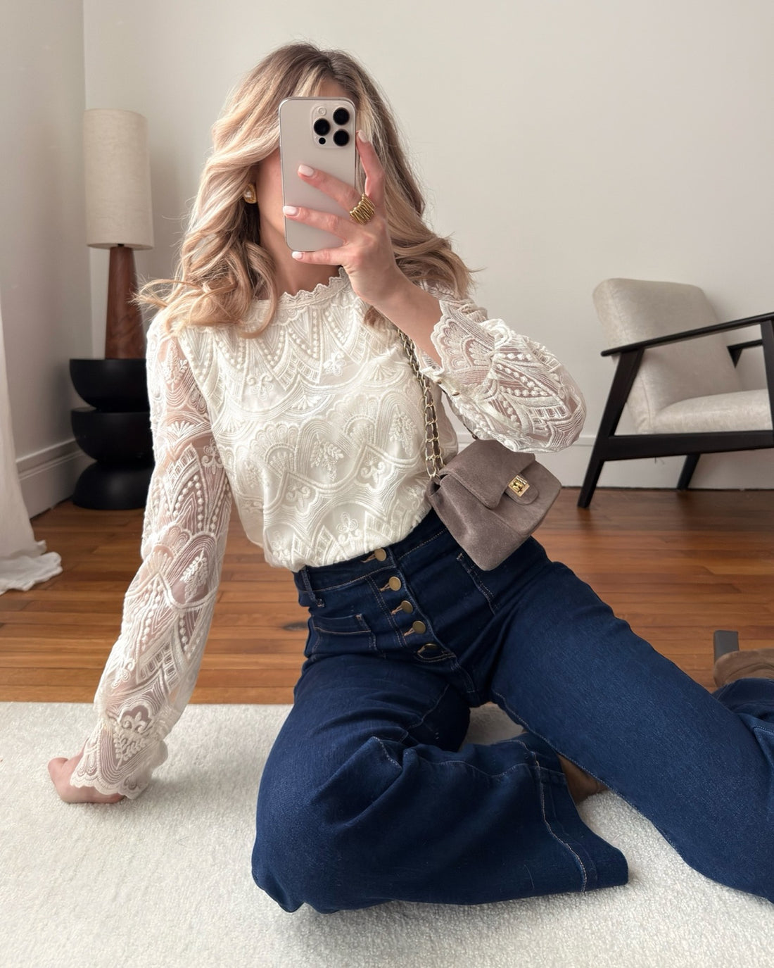 Notre chemisier MENDOLIE en dentelle brodée séduit par son élégance délicate et son allure résolument...