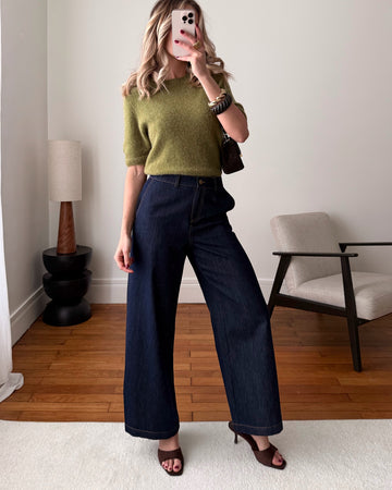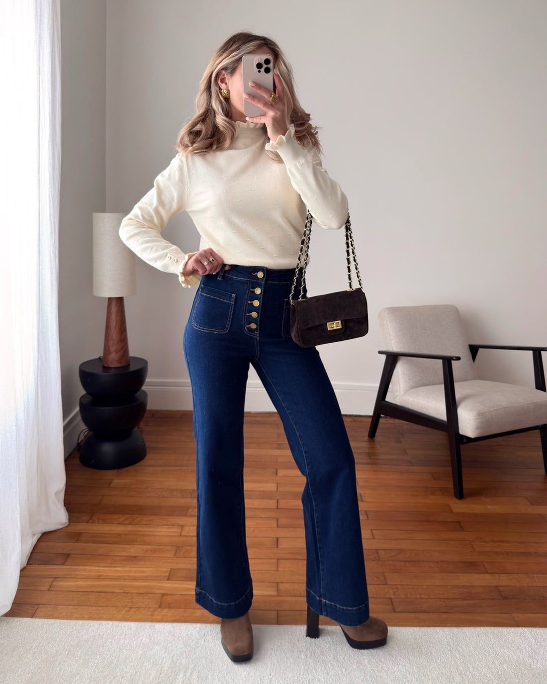 Découvrez le jean LEROY à la coupe flare, rehaussé de boutons latéraux et de...