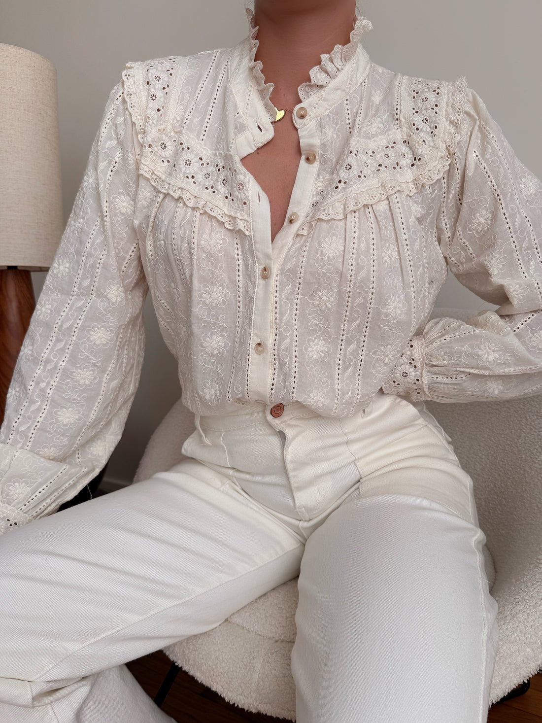Allure romantique et esprit denim : notre chemise SOLANGE à col victorien volanté se distingue...