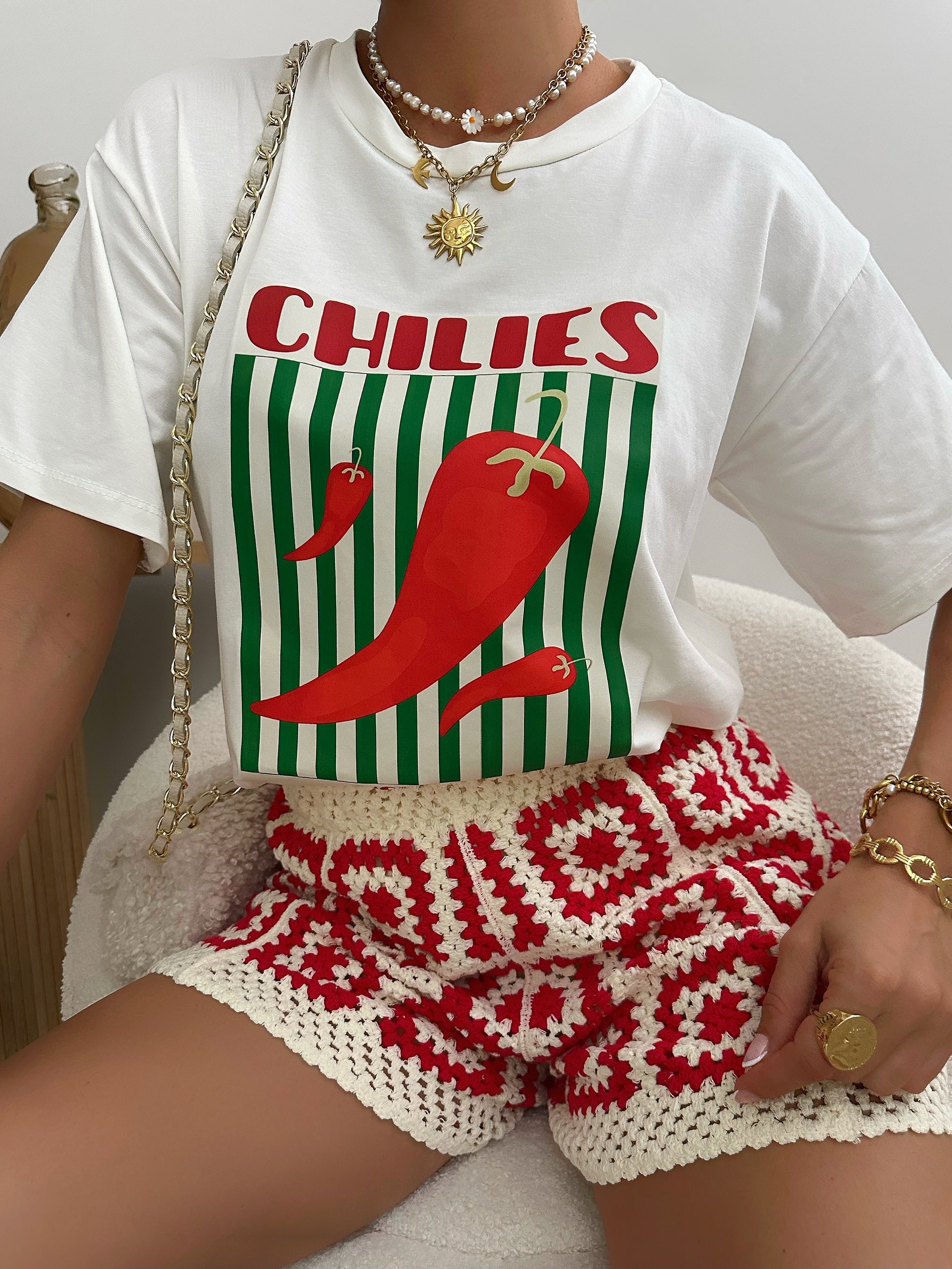 Ce look incarne l’audace colorée et le charme du fait-main. Le t-shirt imprimé piment "Spicy" est une pépite mode qui fait sourire, avec son graphisme rétro et son esprit chili caliente ! Associé au short en maille crochet Davello, confectionné façon granny square rouge et blanc, il compose un ensemble crochet rétro chic et rafraîchissant, parfait pour les vacances.