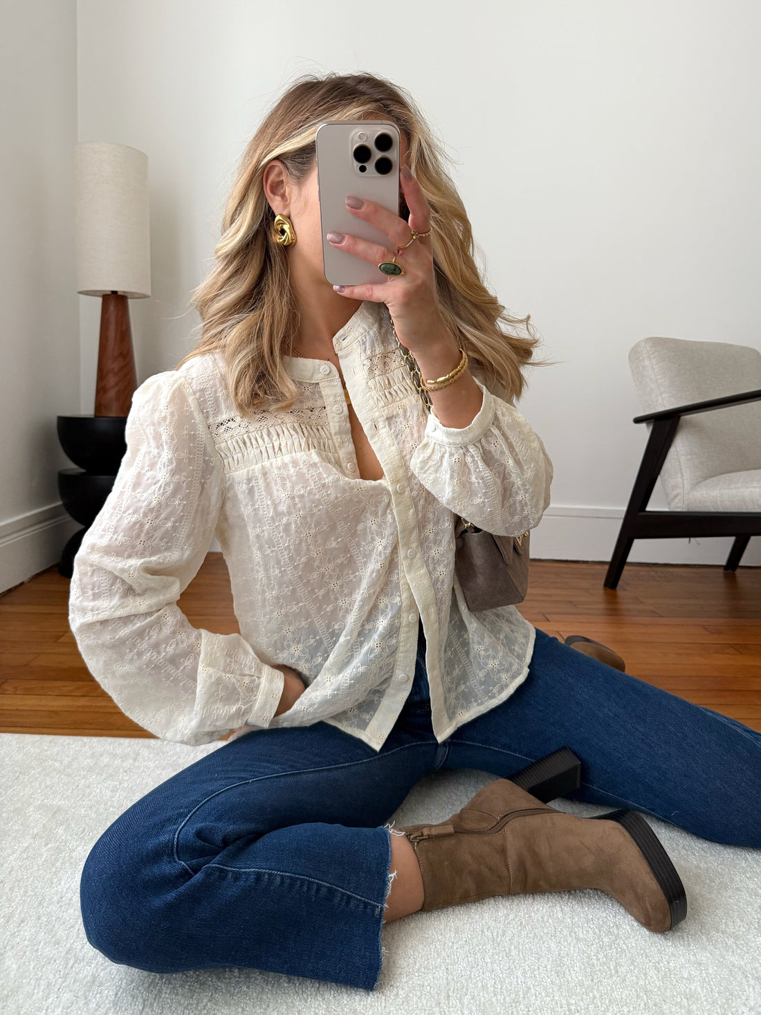 Raffinée et féminine, la blouse LUCIENNE à manches longues séduit par ses fleurs brodées et...
