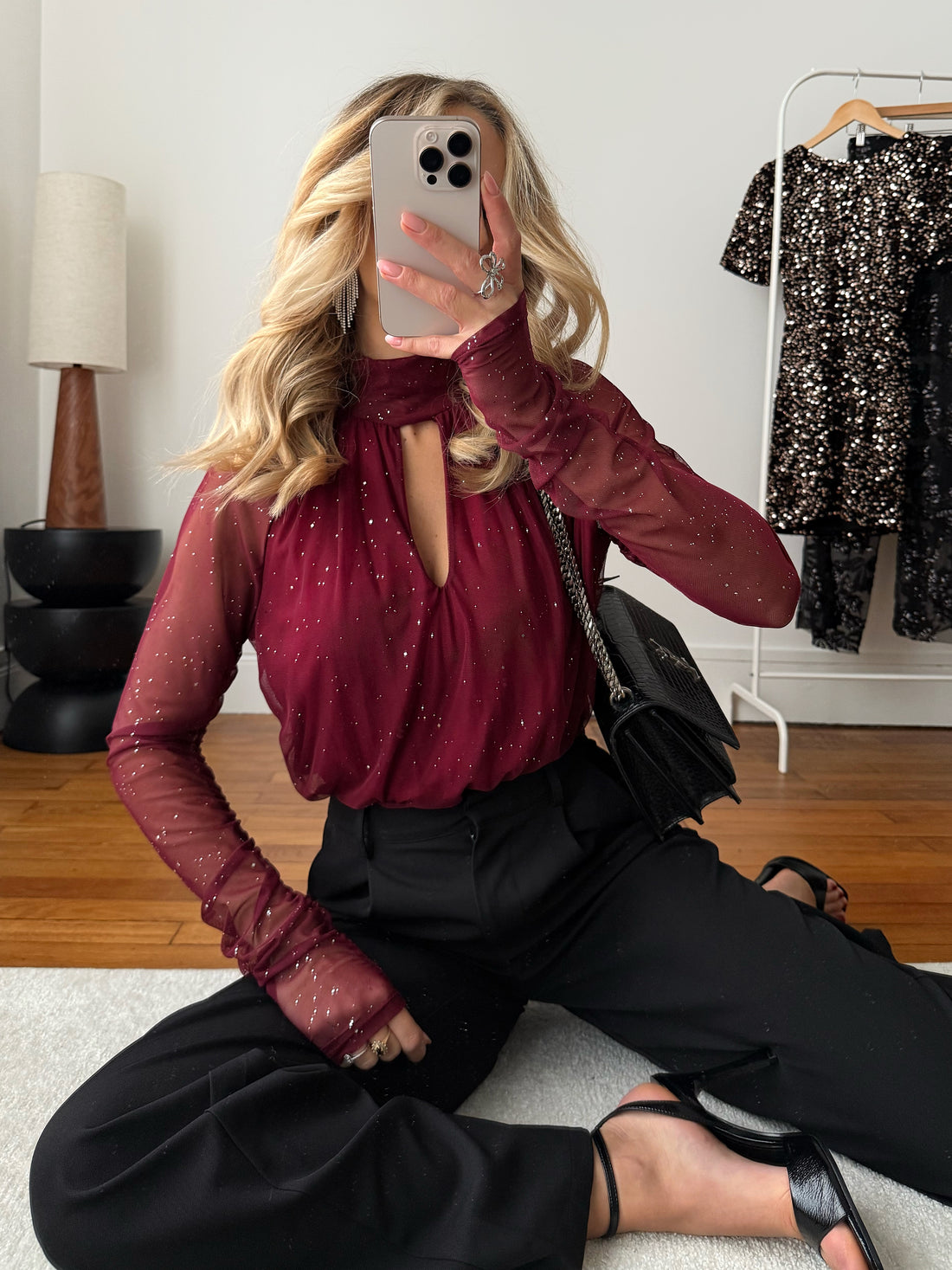 Découvrez le top BIANCHI au col drapé, mêlant velours et sequins pour un éclat irrésistible. Ses...
