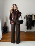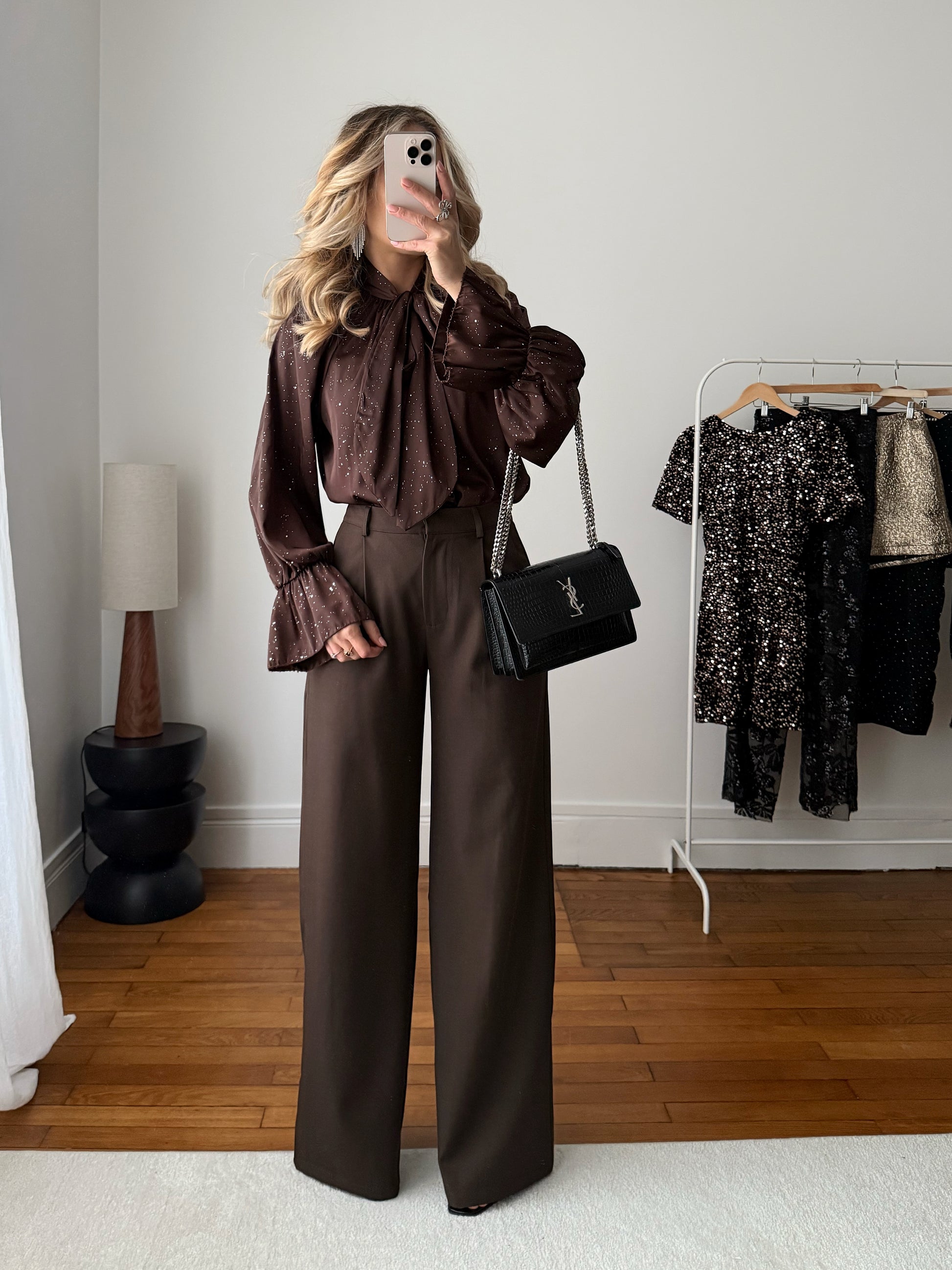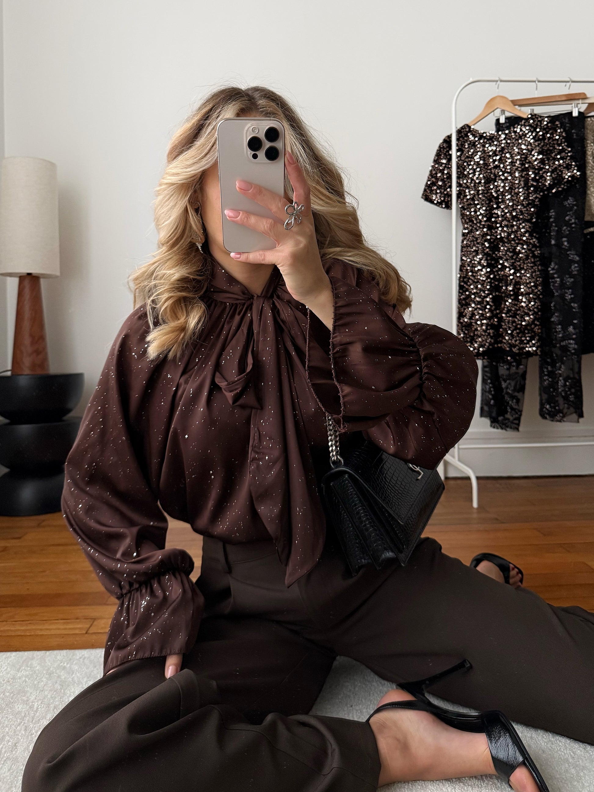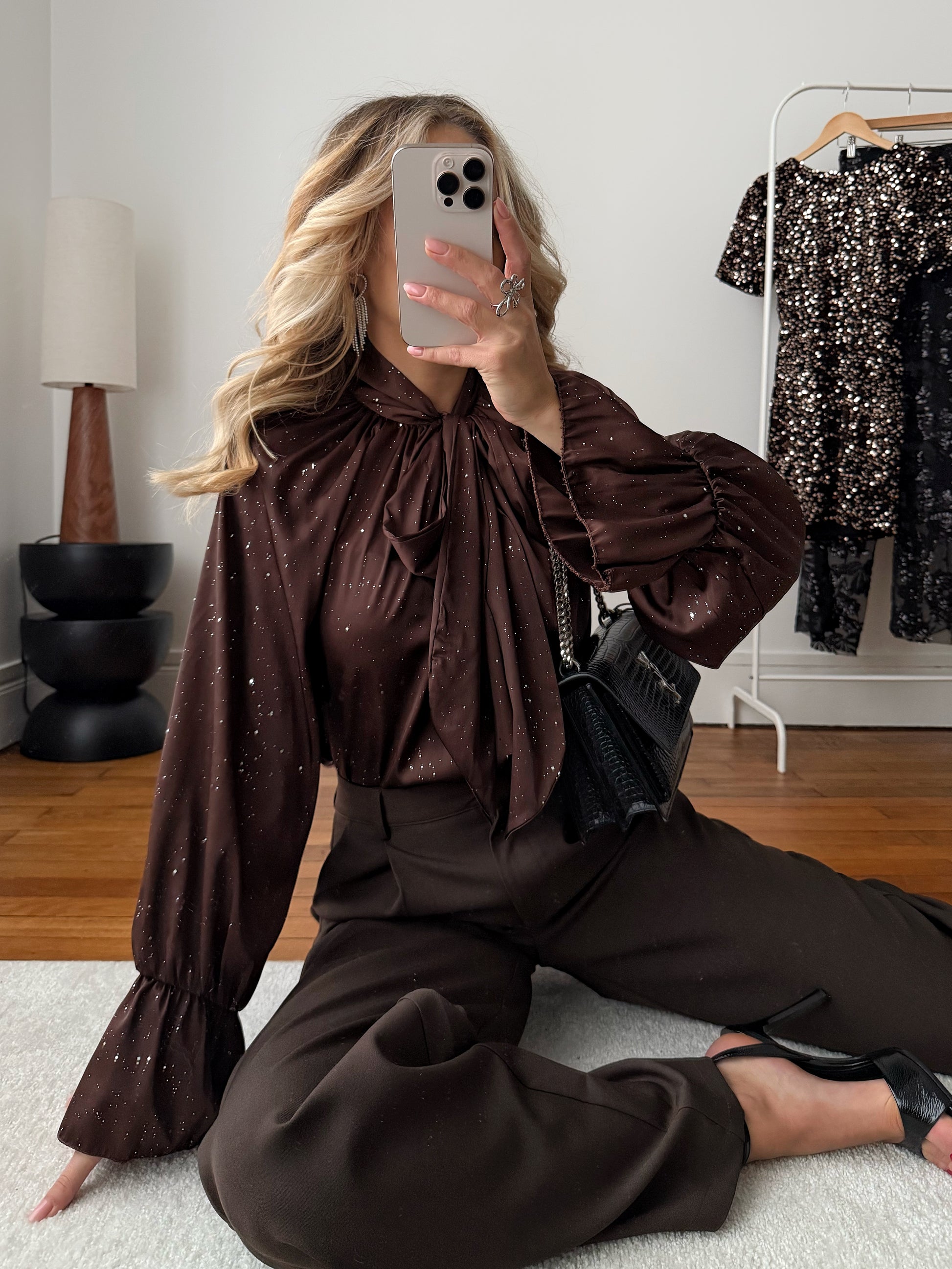 Découvrez notre chemisier FORELLE élégant à col lavallière orné de strass, sublimé par des manches longues raglan. Son bas effet bouffant et ses poignets élastiques volantés apportent une touche raffinée et féminine à votre silhouette.