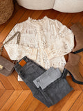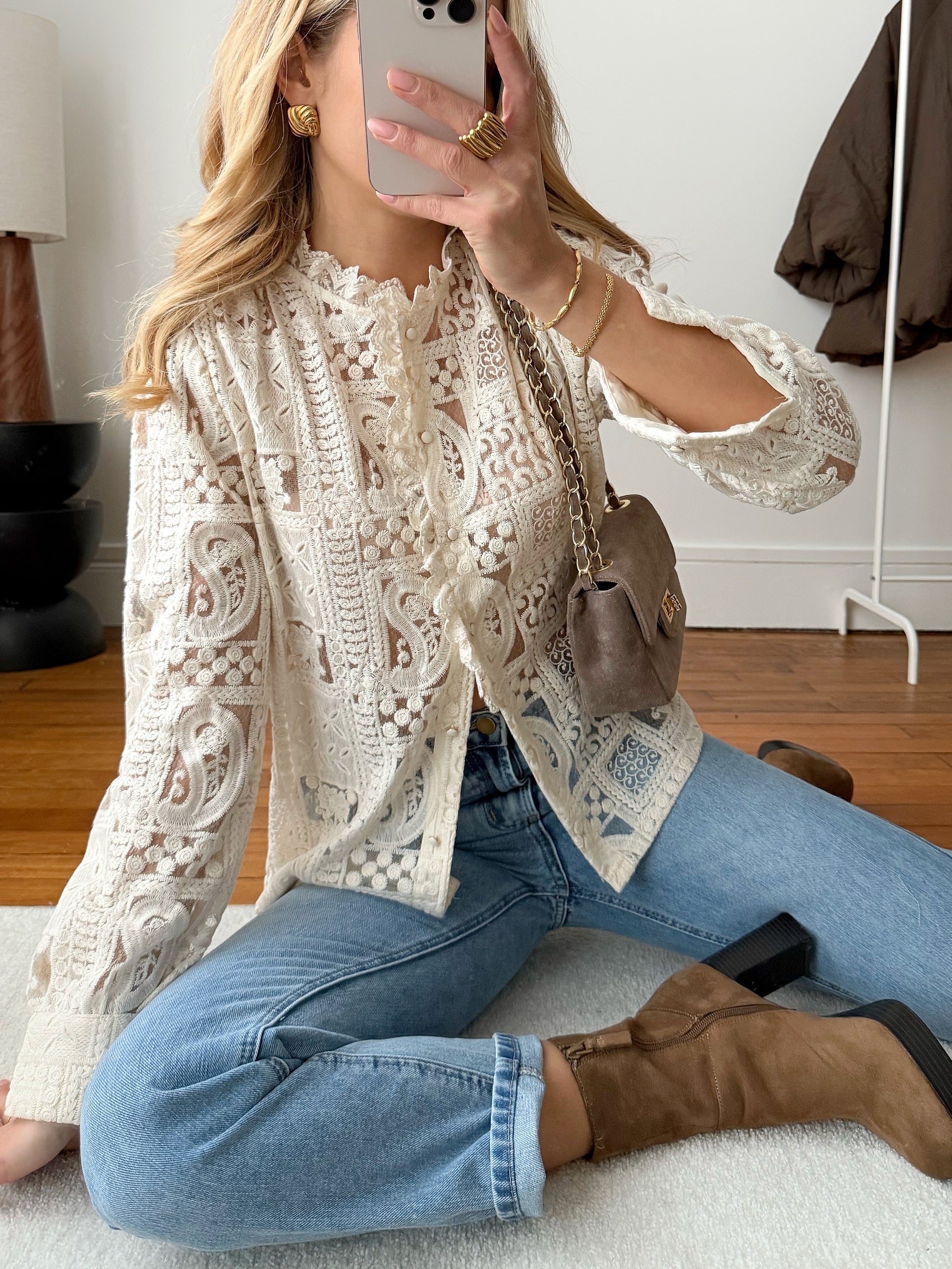 Notre chemisier en dentelle APOLI se distingue par son col rond raffiné et sa patte de boutonnage subtile, soulignant une élégance intemporelle. Sa coupe classique assure un tombé impeccable, offrant une pièce délicate et sophistiquée, idéale pour sublimer toutes les tenues.
