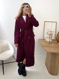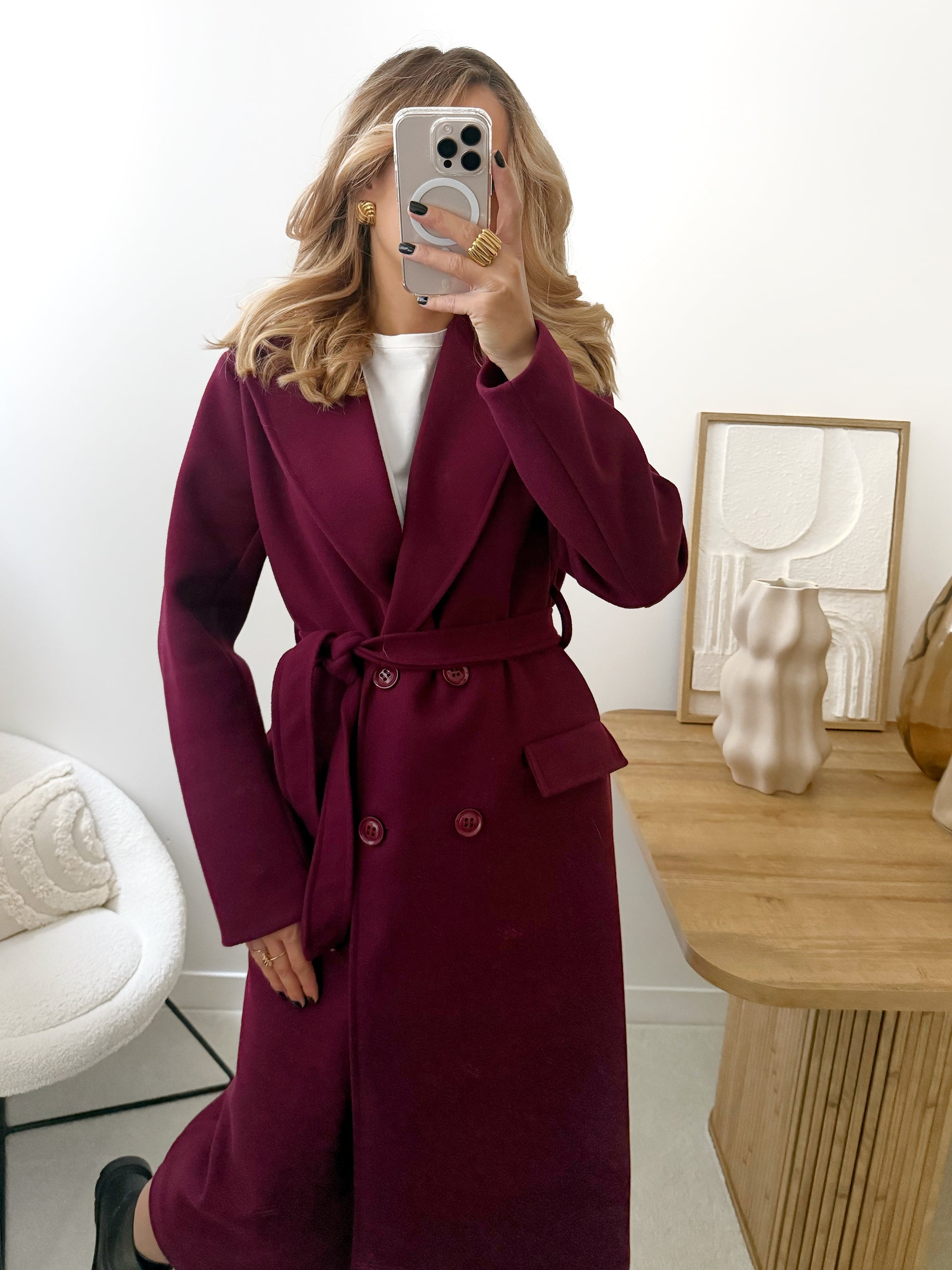 Le manteau coupe droite JOEL à col tailleur, ceinturé pour structurer la silhouette, allie élégance intemporelle et confort soyeux.