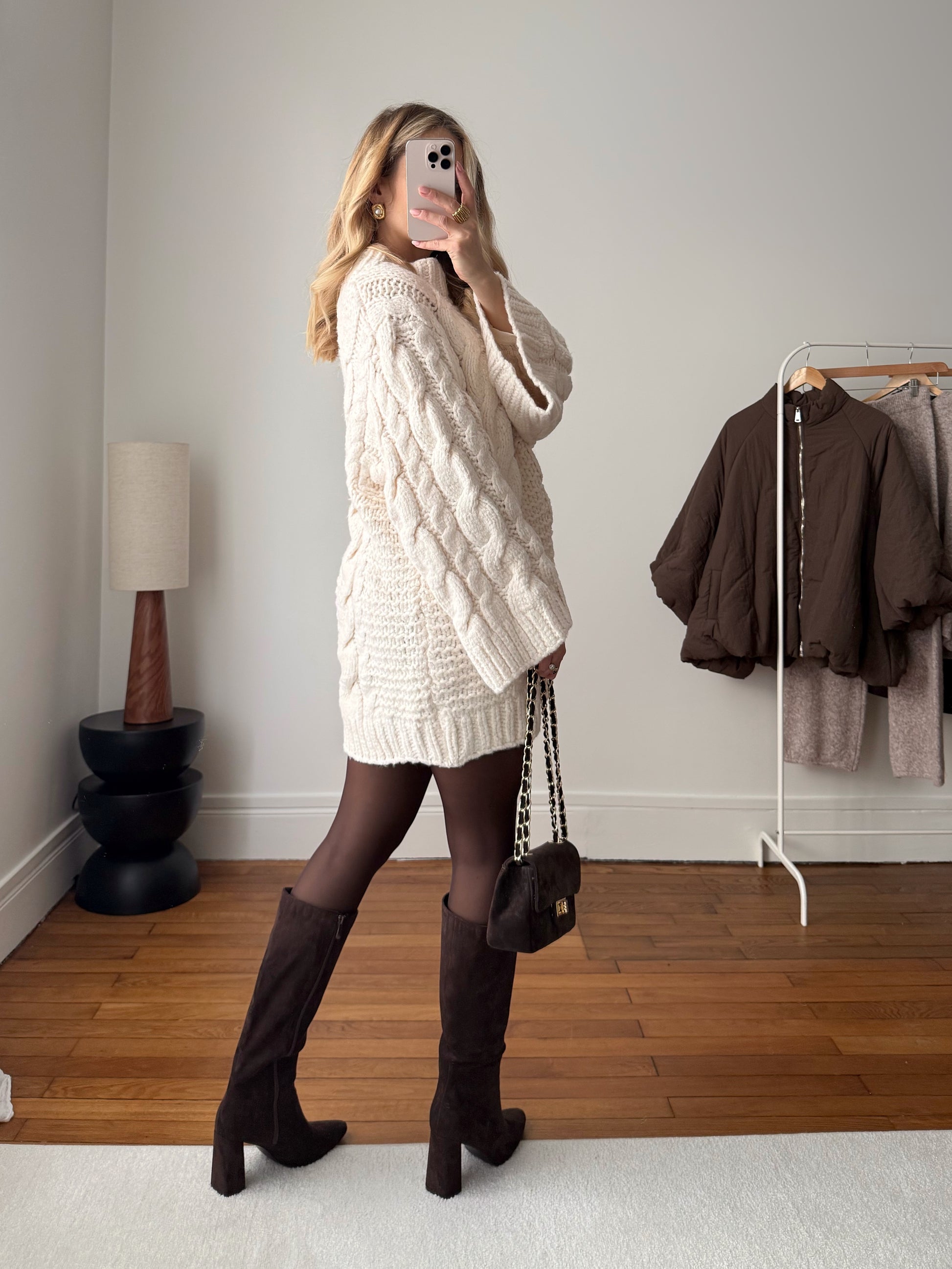 Découvrez la robe en maille CASIMIR oversize à col rond, tricoté dans une maille chaude et épaisse. Ses torsades apportent du relief et du charme à cette pièce cosy et tendance.