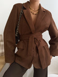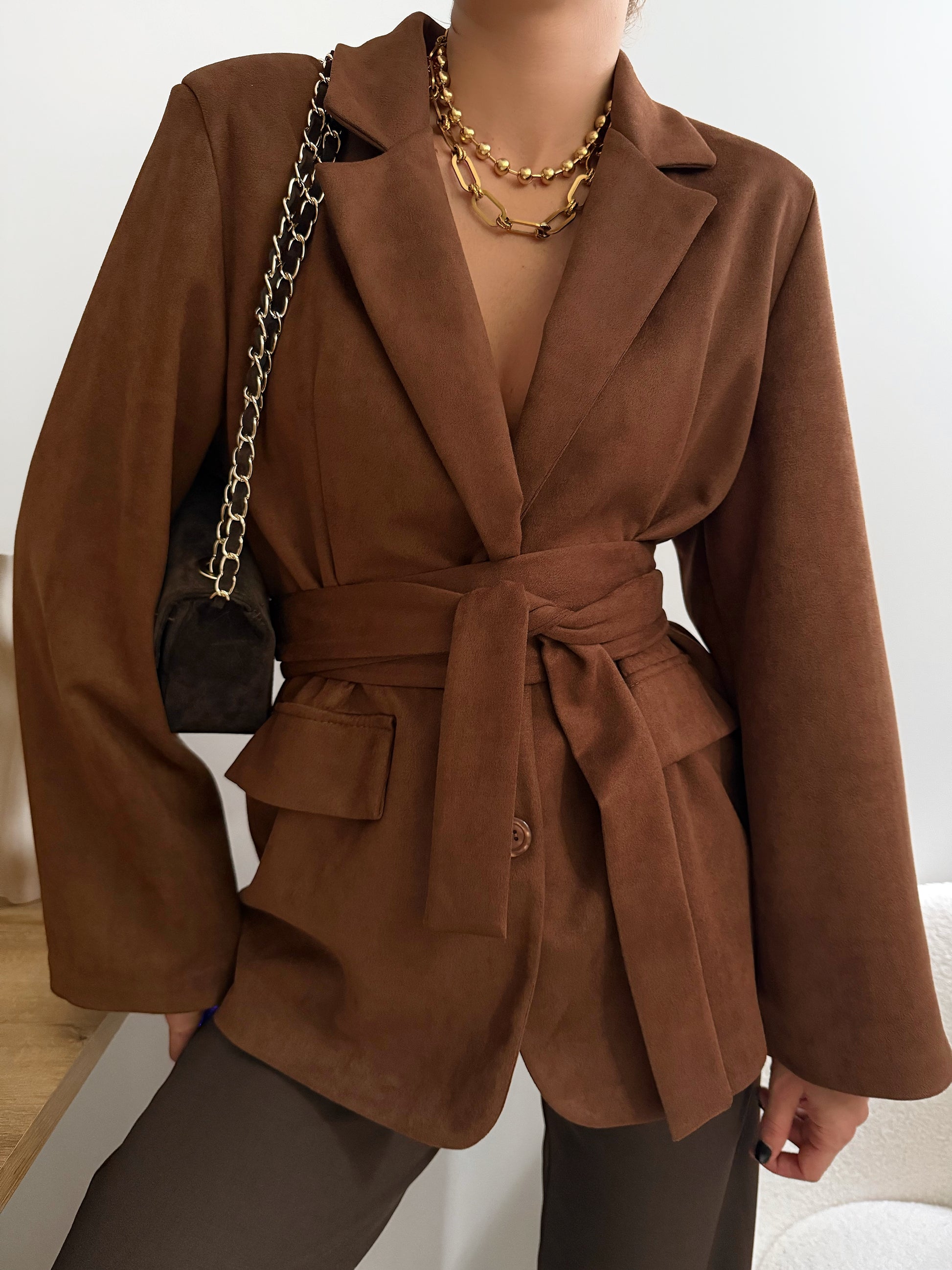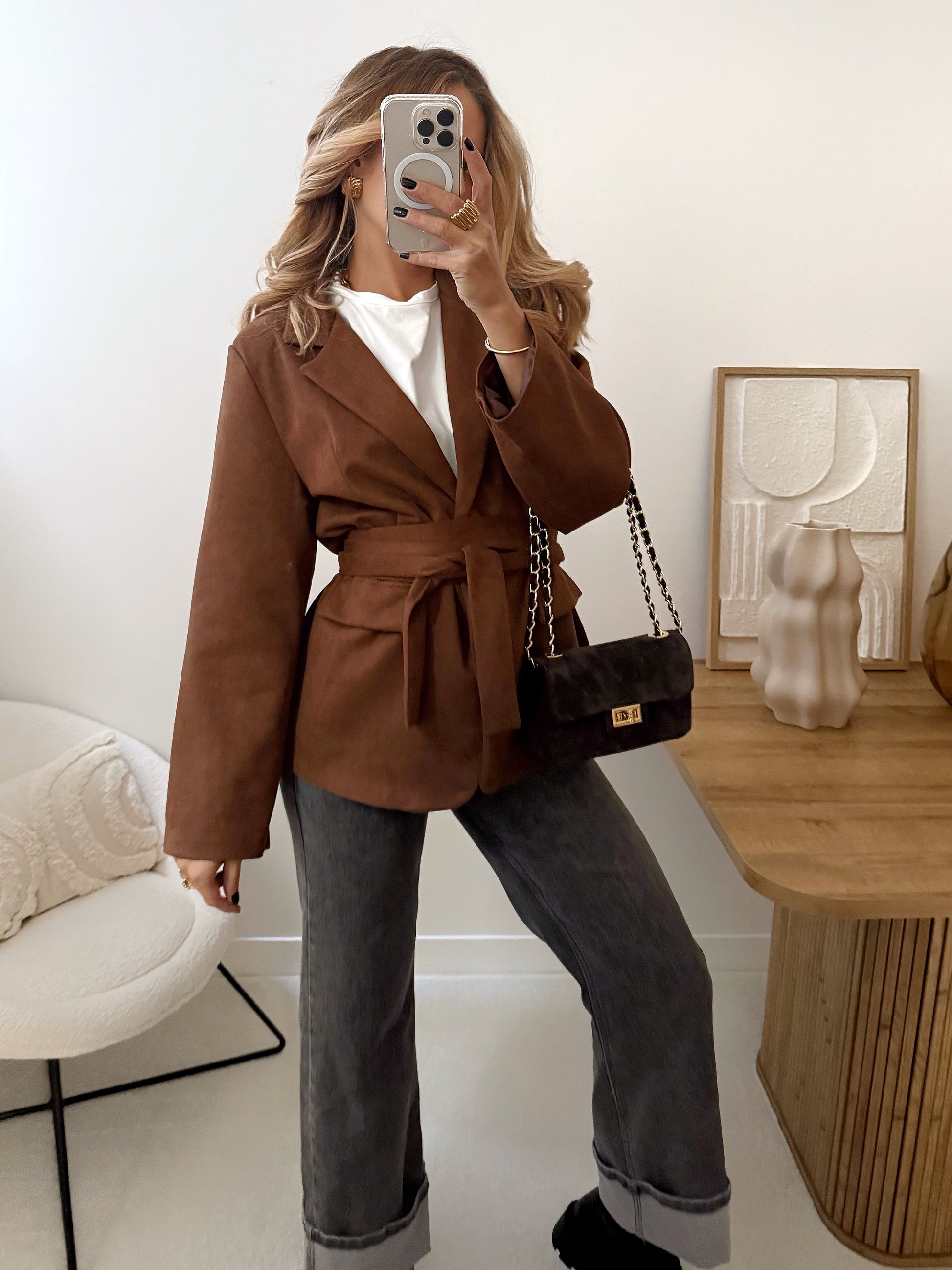 Découvrez le blazer en suédine PIEDRA au style chic et moderne. Son col tailleur, sa fermeture boutonnée et sa ceinture structurent la silhouette, tandis que les fausses poches à rabat et la doublure apportent confort et élégance.