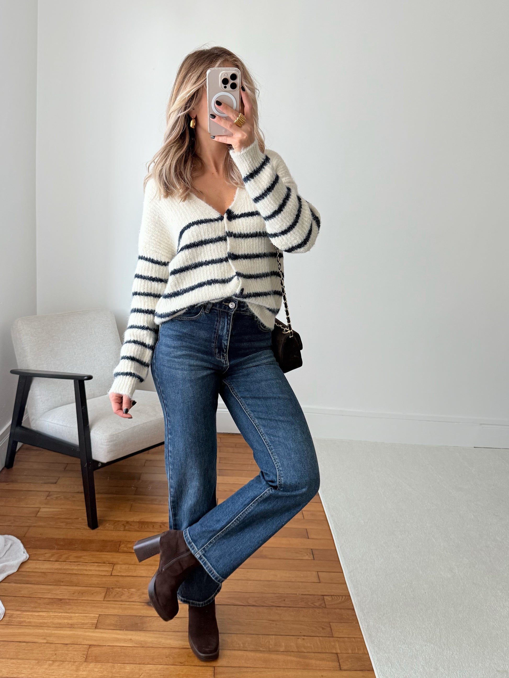Craquez pour la cardigan marinière oversize PASSY, à col V et manches longues, rehaussé de charmants boutons en forme de cœur pour une touche féminine et originale.