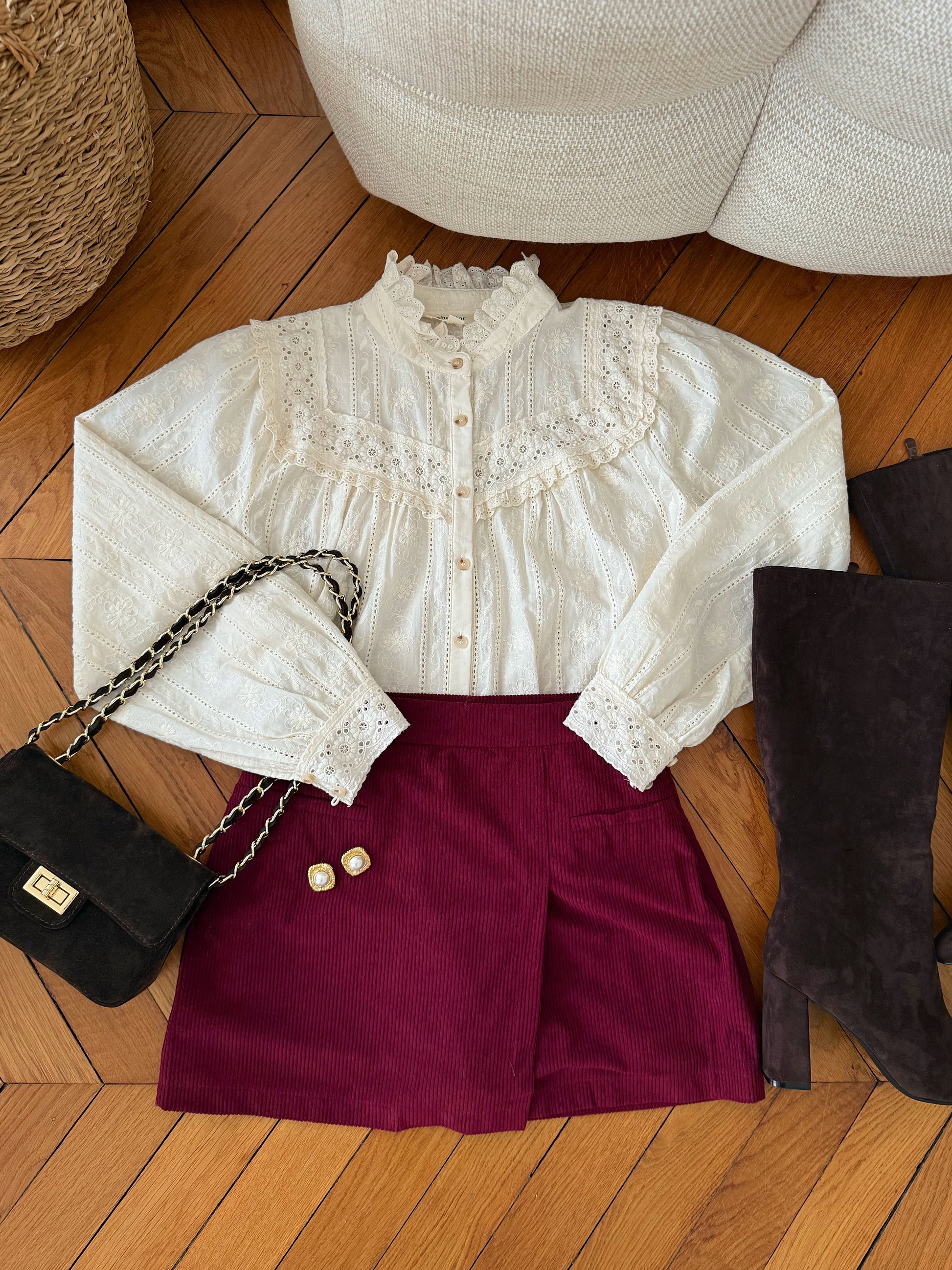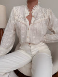Découvrez la blouse romantique MARIBEL à manches longues, sublimée par des fleurs brodées et des détails de broderie ajourée. Son col et ses poignets volantés, ainsi que sa patte de boutonnage, apportent élégance et féminité à votre look.