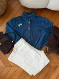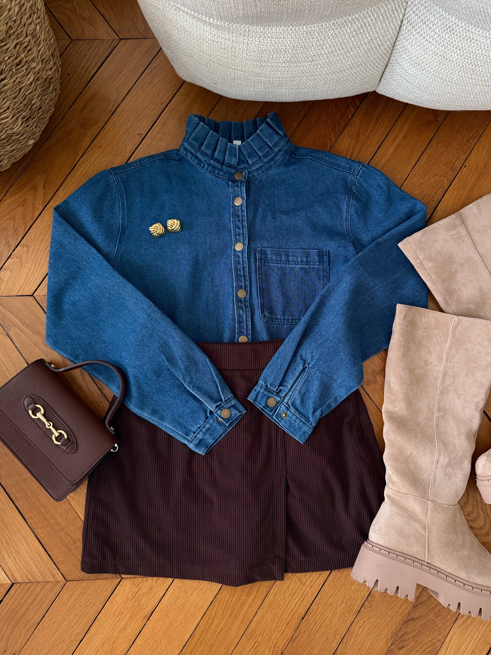 Allure romantique et esprit denim : notre chemise SOLANGE à col victorien volanté se distingue par sa poche plaquée et sa patte de boutonnage à boutons pression. Un essentiel chic et audacieux du vestiaire féminin.