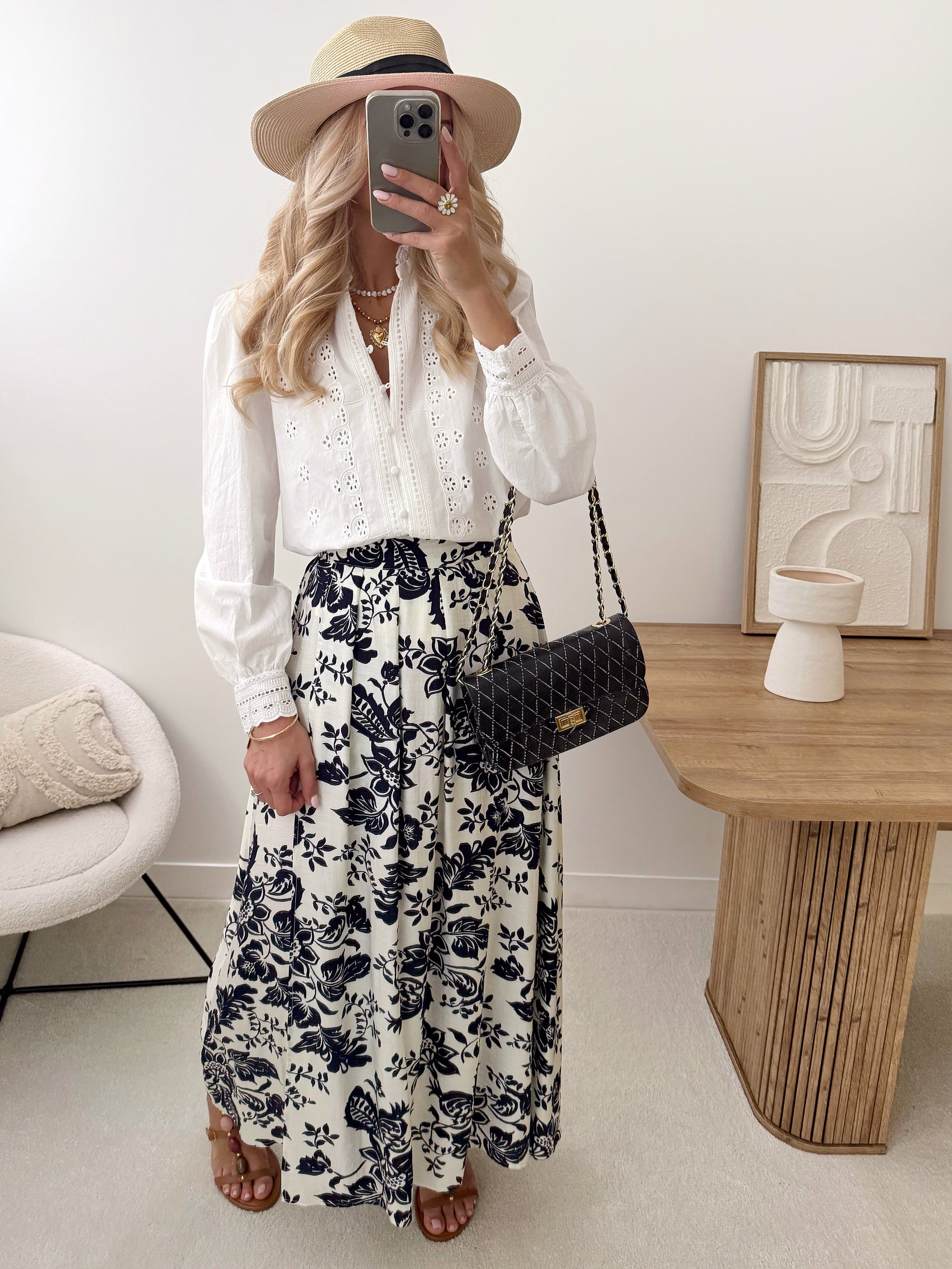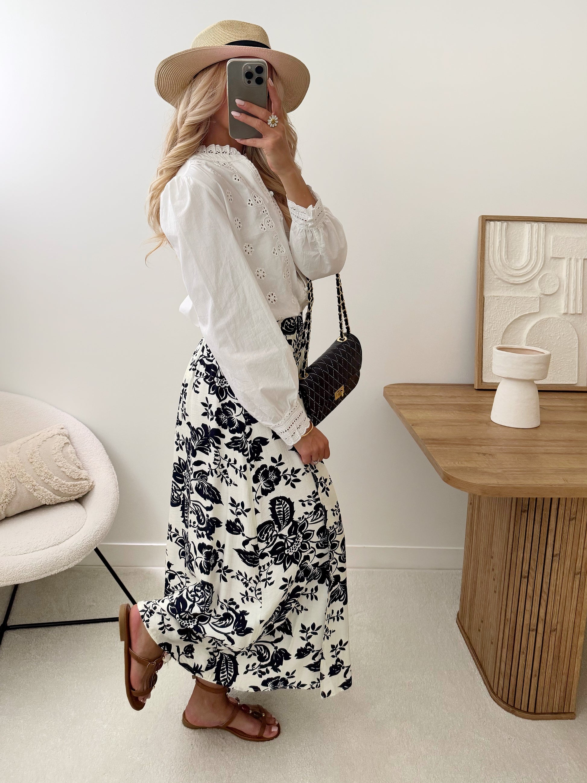 La jupe longue évasée AUGUSTINE est une véritable ode à la légèreté et à la féminité. Son imprimé floral délicat habille le tissu de motifs inspirés de la nature, apportant fraîcheur et douceur à chaque mouvement. Confectionnée dans une matière fluide et aérienne, elle glisse avec grâce autour de la silhouette et accompagne chaque pas avec élégance. Sa taille élastique à l’arrière assure un maintien confortable tout en s’adaptant parfaitement à la morphologie, créant une belle ligne naturelle. Facile à porter au quotidien comme pour une occasion spéciale, cette jupe se marie aisément avec un chemisier en lin ou un t-shirt basique rentré pour un contraste casual. Côté chaussures, sandales plates, espadrilles ou même baskets s’y prêtent parfaitement. Une pièce incontournable pour composer un look bohème chic, romantique ou tout simplement frais et naturel, au rythme des saisons ensoleillées.