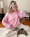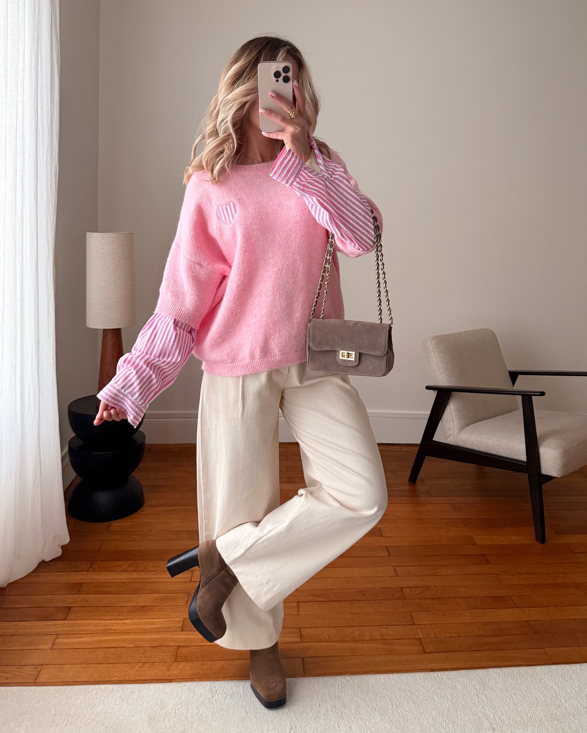 Adoptez notre maille bi-matière REYNOLDS, alliant douceur et chaleur, rehaussée de manches de chemise à rayures pour un contraste moderne. Le cœur brodé délicat apporte une touche féminine et originale, parfaite pour sublimer toutes vos tenues.