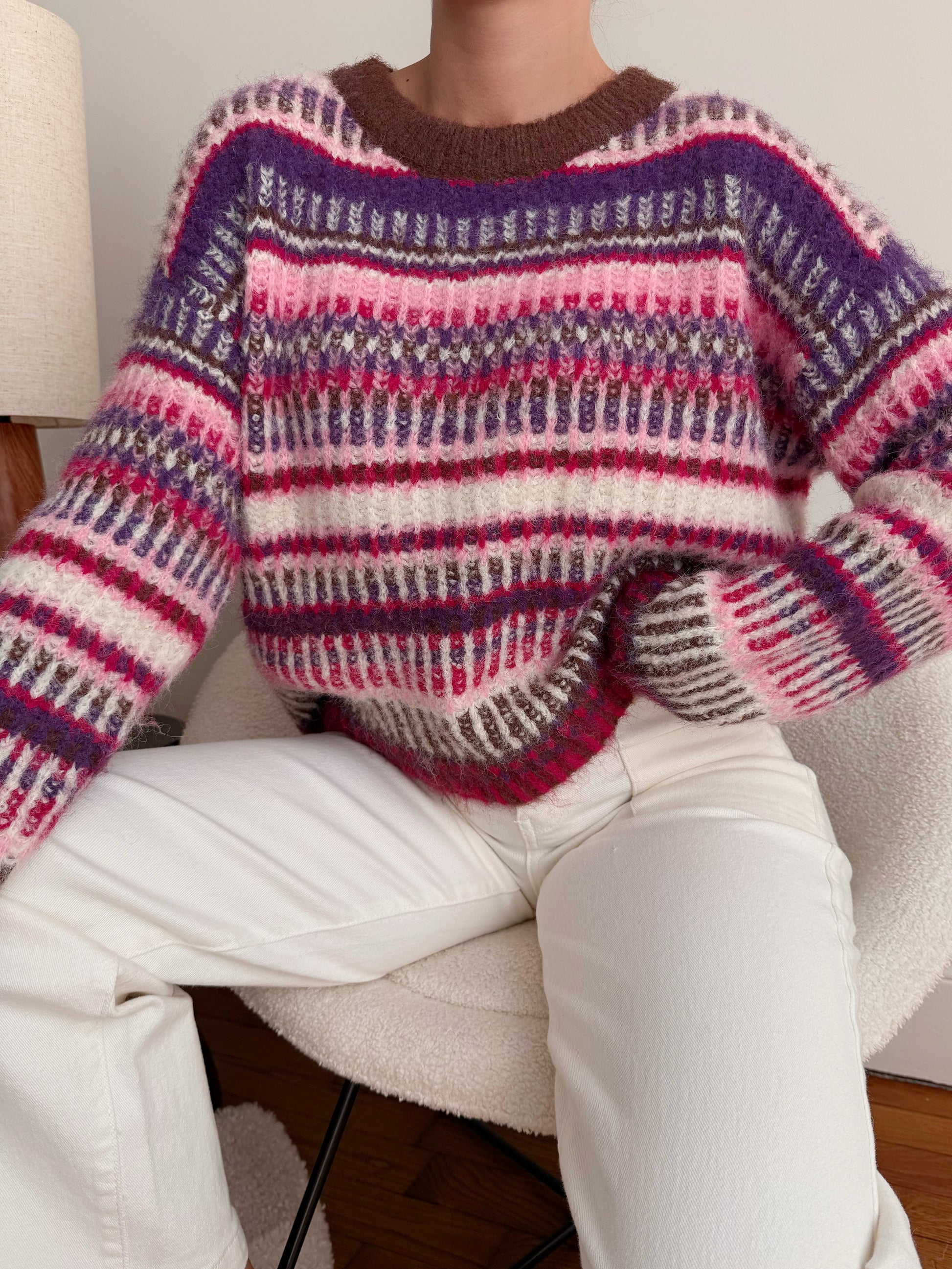 Découvrez la maille multicolore FERETI au col rond, à la fois chaude et colorée. Sa coupe légèrement oversize et ses manches longues en font la pièce parfaite pour un look cosy et tendance.