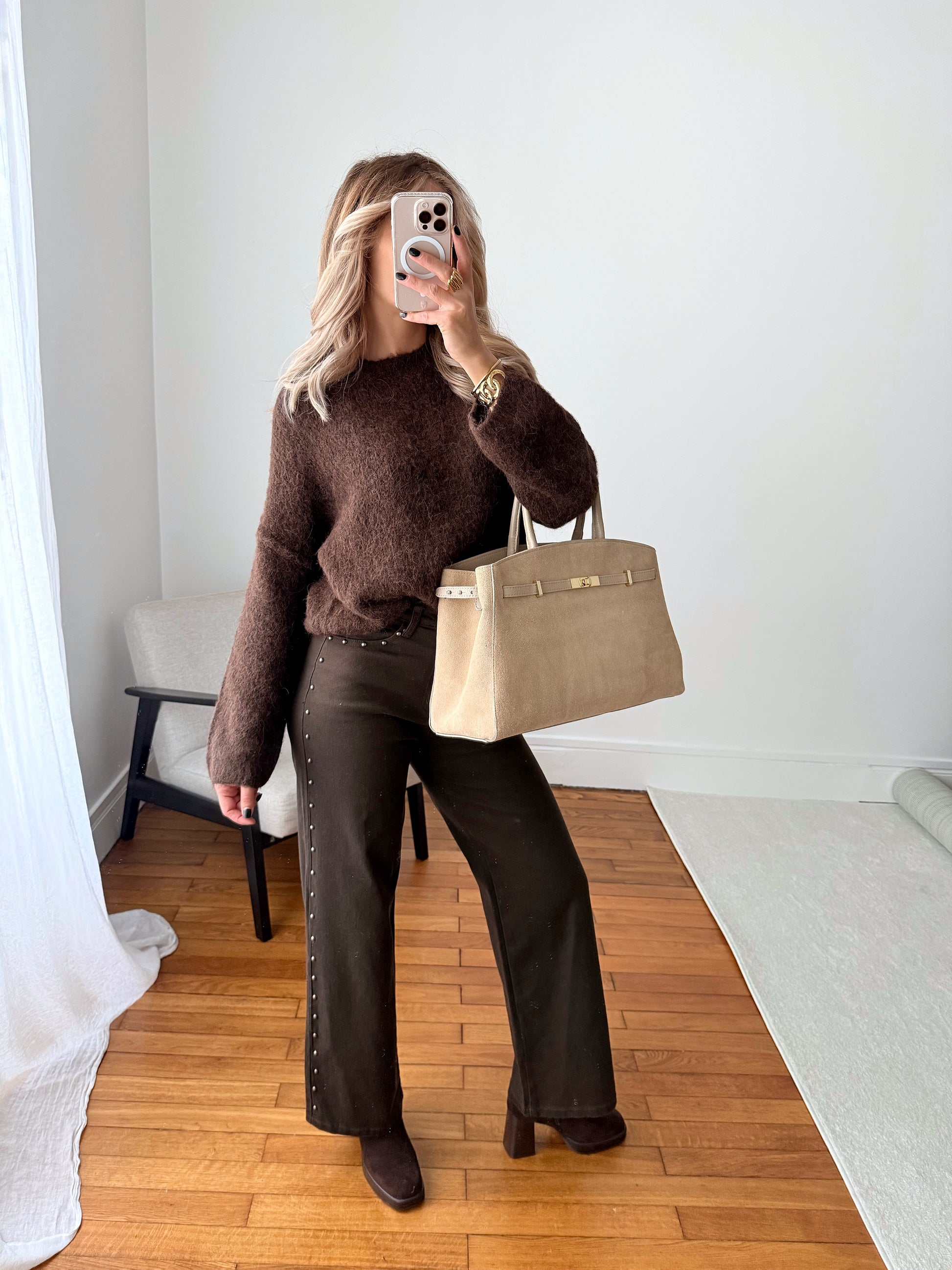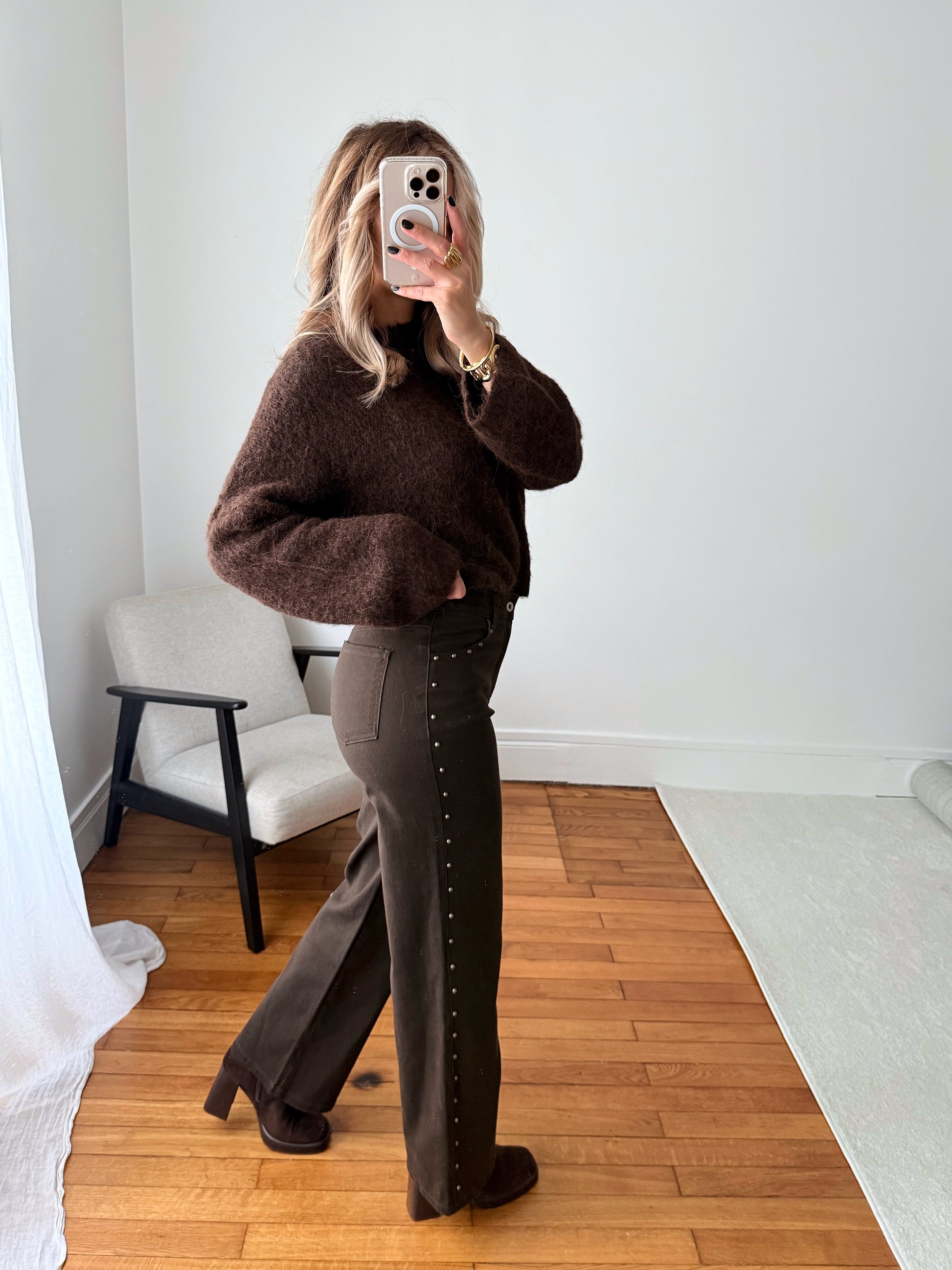 Notre jean taille haute RIGEL à la coupe droite séduit par ses finitions cloutées, mêlant élégance urbaine et raffinement discret.