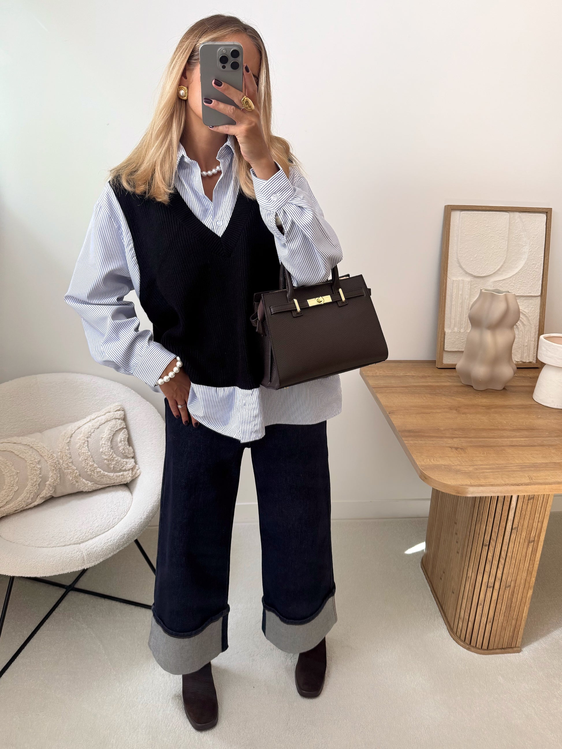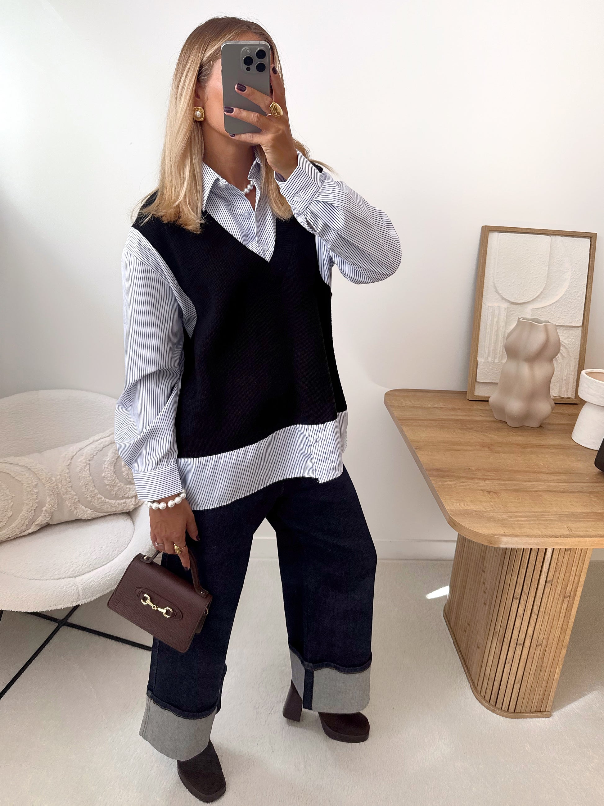 Le pull chemise LEONCE 2 en 1 qui marie l'élégance d'une chemise à rayures au confort d'un pull en maille. Le col chemise dépasse du col V, créant un jeu de textures et de motifs. Une pièce ingénieuse pour un style sophistiqué sans effort.