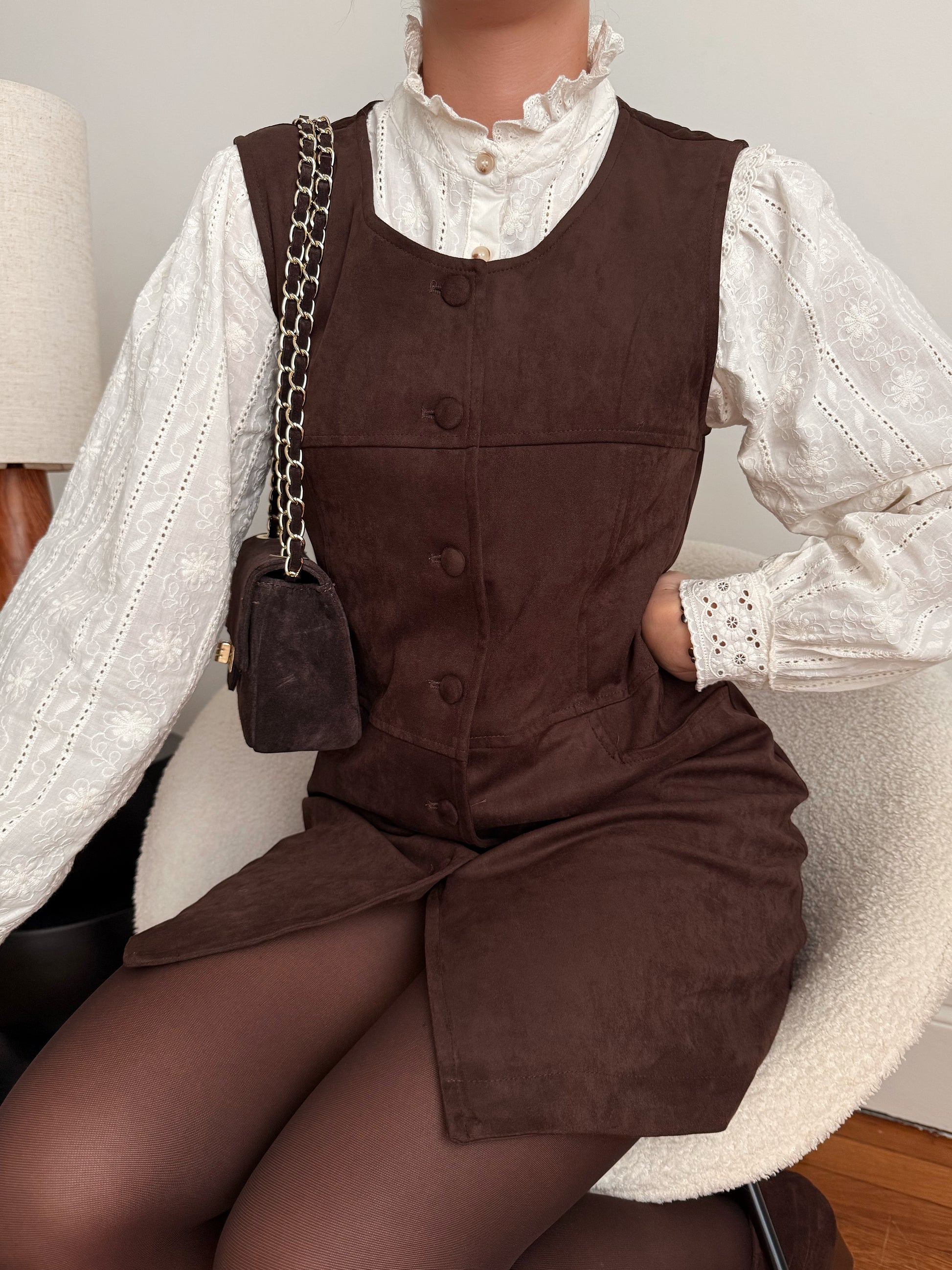 Douce et élégante, notre robe RIVA en suédine séduit par sa coupe ajustée qui sublime la silhouette. Sans manches et dotée d’une ouverture boutonnée sur le devant, elle allie confort et féminité pour un look chic en toute simplicité.