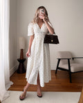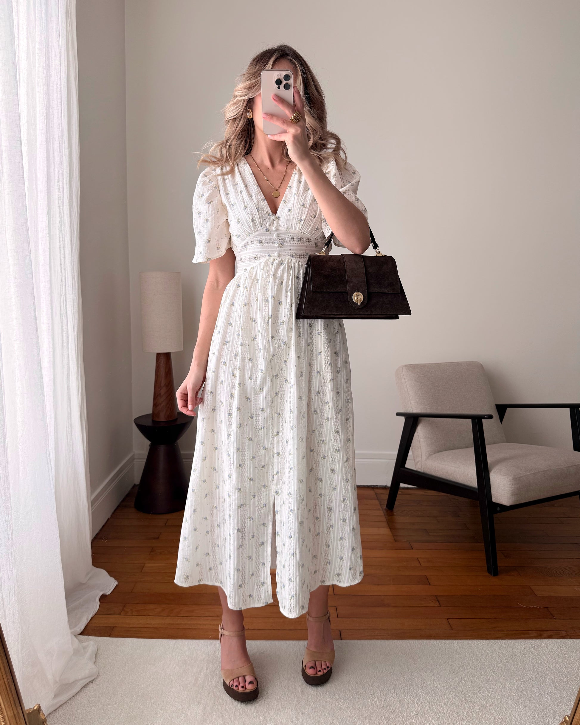 Découvrez la robe longue NEAH à imprimé floral au charme champêtre. Ses manches courtes, son décolleté en V et ses boutons sur le buste mettent en valeur la coupe empire, tandis que la doublure et les empiècements de dentelle apportent élégance et légèreté.