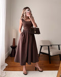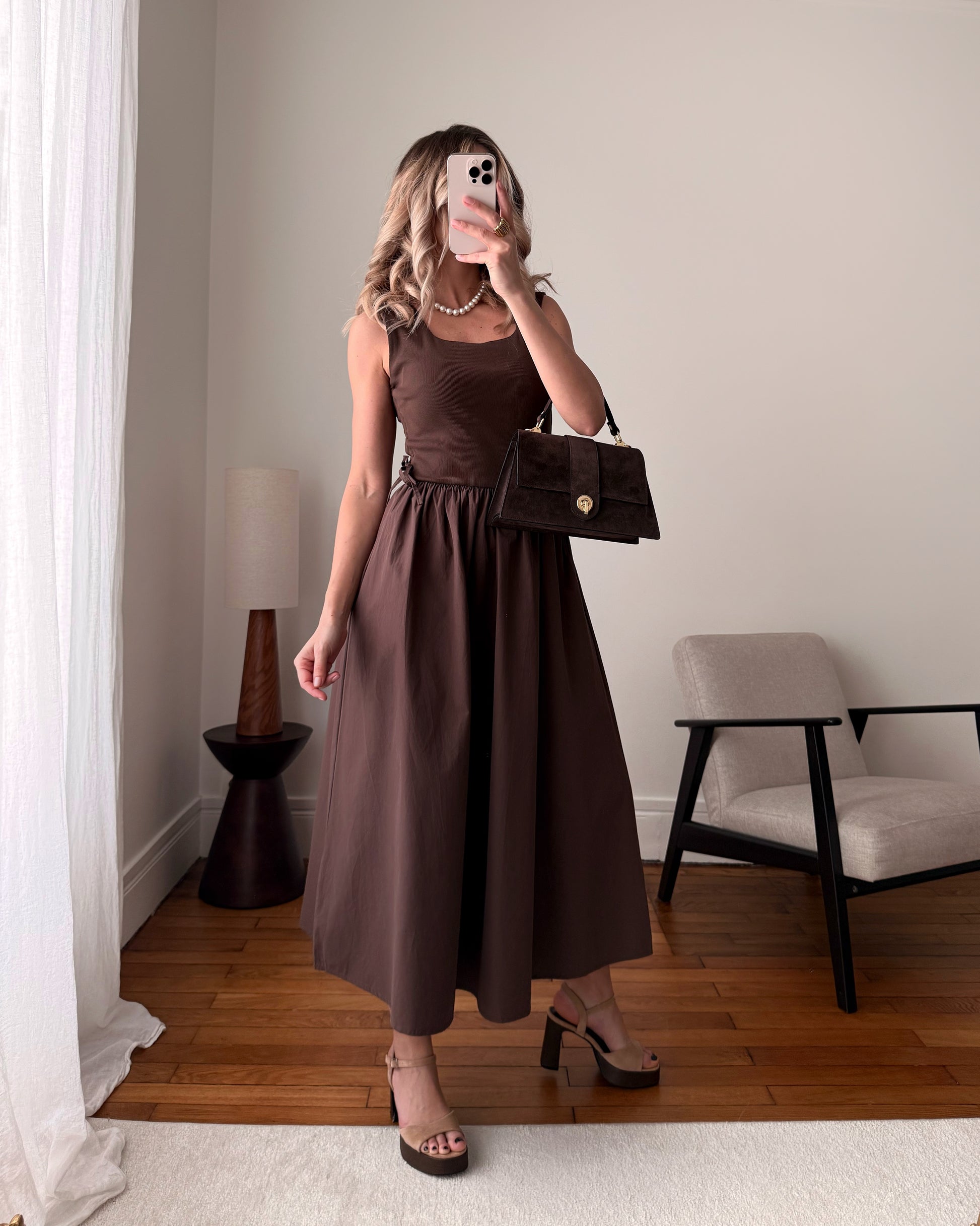Robe longue bi-matière à bretelles LEYROS - chocolat PRÉCOMMANDE