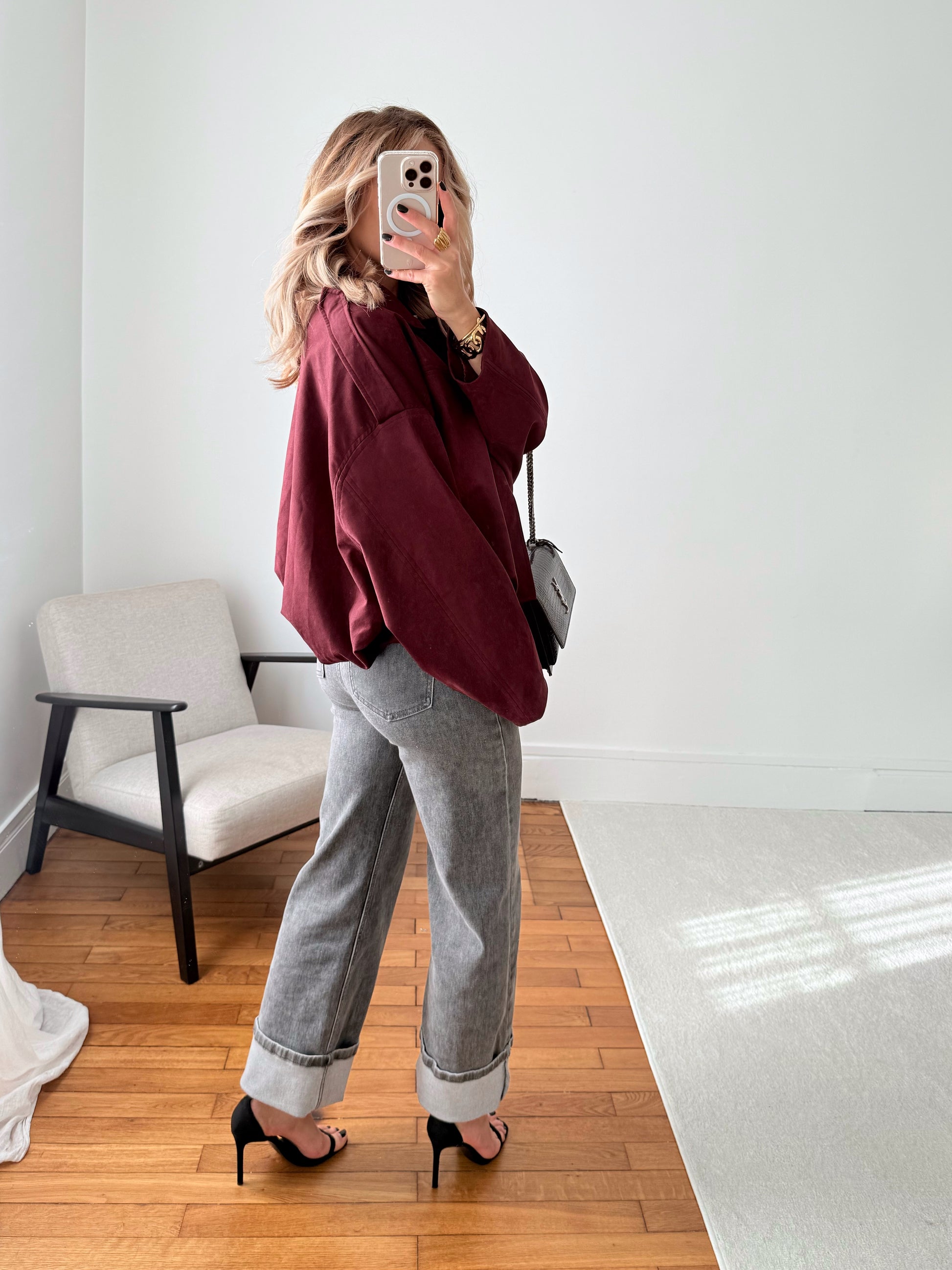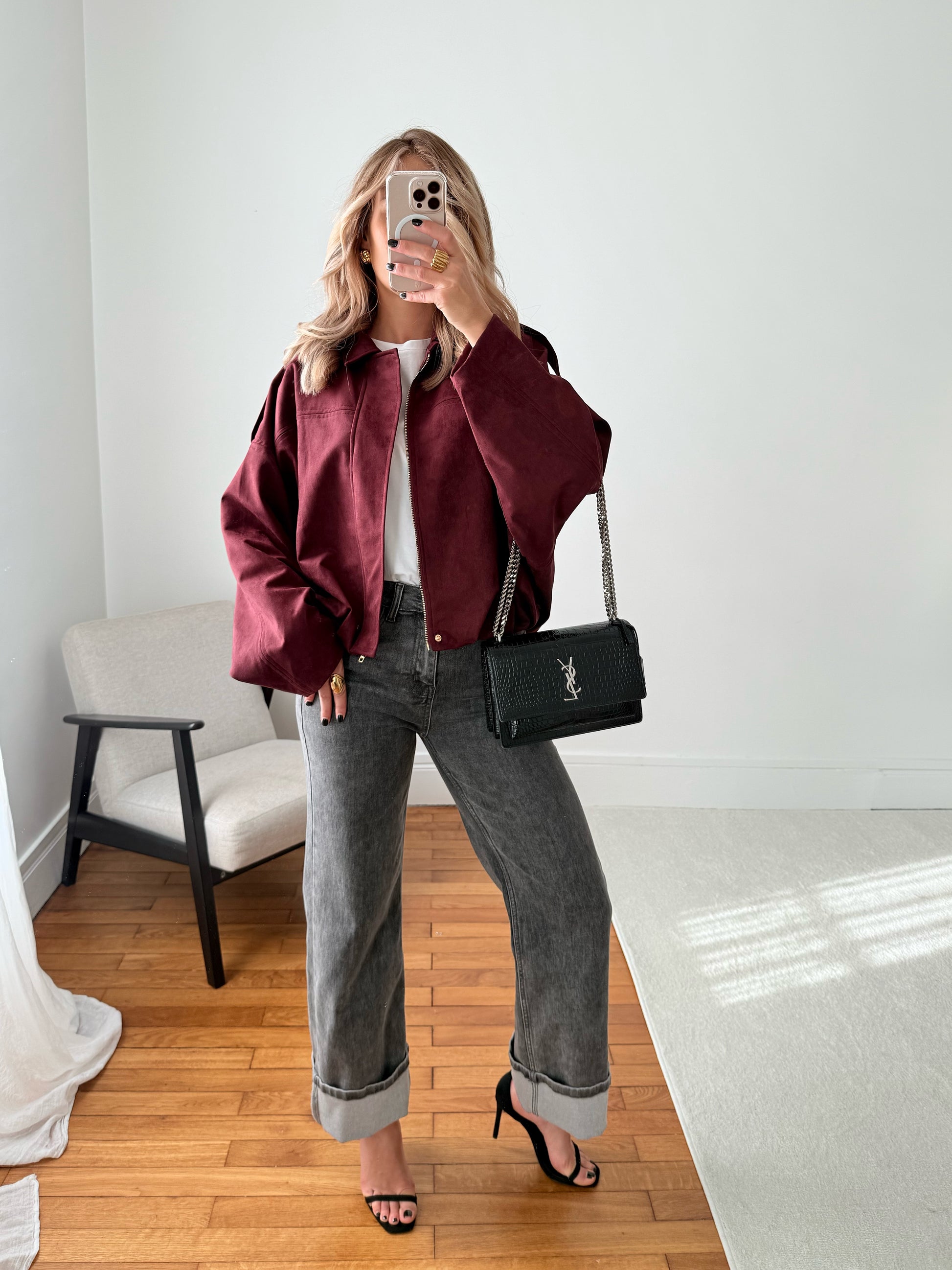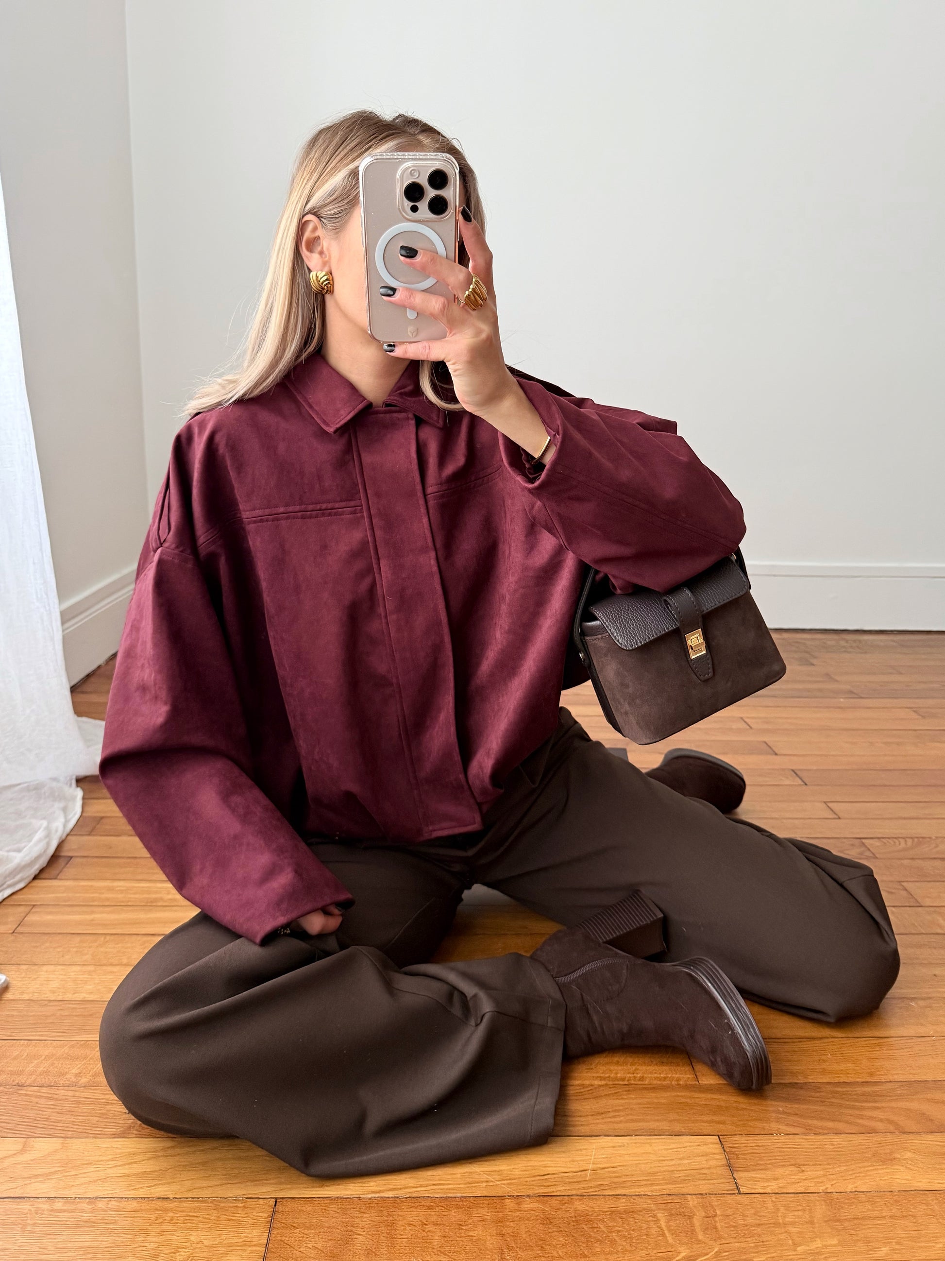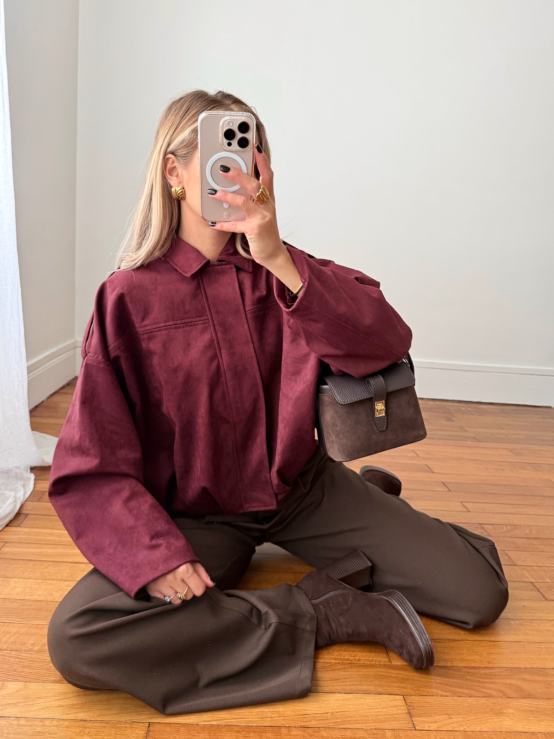 Découvrez la veste ballon HASPEN en suédine au style moderne et décontracté. Son col chemise, sa fermeture zippée discrète et ses boutons-pression apportent élégance et praticité, tandis que les emmanchures basses et les deux poches latérales assurent confort et style.